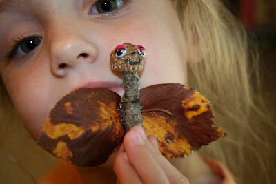 The girls and I went on a "nature hunt" and collected sticks, twigs, pine cones, pine needles, and acorns. We came home and created these adorable little creatures. Unfortunately, at this point, I only have one left. It's on my "Fall" shelf right now. I guess we should make more.
